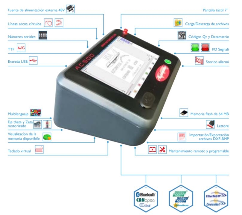 Gracias a su pantalla táctil de 7” el control AC500, permite una navegación simple e intuitiva entre programas y dentro del software de marcado. Equipado con un puerto USB y conectores de I/O, que permiten utilizarlo en los sistemas de las series ADP y ASM tanto en integración, como en sobremesa y en modo portátil.